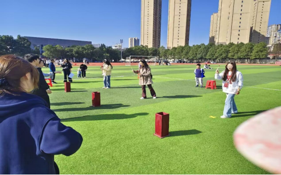 上午9:00举行开展仪式,由历史专业负责人张霞老师致辞,强调历史文化传承与创意表达的意义,随后宣布游园会正式开始,学生自由入场。在游园现场,古韵与欢声交织。投壶区前,木壶静立,羽箭轻悬,同学们敛气凝神,抬手、瞄准、投矢,复刻着古人宴饮雅乐中的礼仪风雅。“一箭入壶终得趣,半分专注半怀诗”,当羽箭稳稳落壶,满堂喝彩声里,不仅是竞技的喜悦,更有对传统礼仪文化的躬身体悟。在套圈区前,同学们手握圆环,跃跃欲试,将圆环稳稳落在蓝色安全锥上,赢得群众的欢呼与喝彩。让我们再一次感受到了古人宴饮场面的热闹气氛。