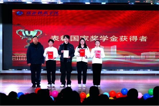 随后,2024-2025学年国家奖学金获得者程璟、杨坤、田晋玮、高云迪、张定波登台接受表彰,将大会推向高潮。作为获奖代表,22历史班杨坤同学真挚分享了其求学路上的思考与坚持,他的讲述深深打动了在场师生,现场多次响起经久不息的掌声。