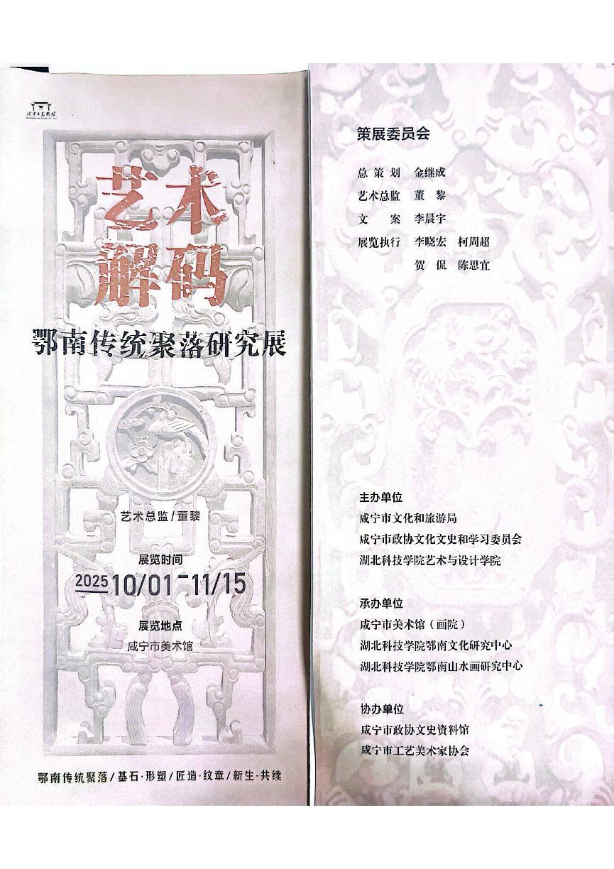 作为承办单位之一,湖北科技学院鄂南文化研究中心(以下简称“中心”)充分发挥其在鄂南地域文化研究领域的优势及特色民俗藏品,为展览提供了丰富的实物展品和学术支持。本次展览以董黎博士的专著《鄂南传统聚落研究》为脉络,系统展示了鄂南传统聚落的生成机制、空间序列与装饰艺术,引发公众对文化遗产保护的深度思考。中心主任何岳球表示,此展览是推动鄂南文化动态保护与传承的重要一步,旨在将传统文化融入当代生活中,让市民近距离感受鄂南聚落的建筑智慧与文化底蕴;同时,此次活动大大推进了校际合作、校地合作,促进了鄂南传统聚落的研究及多维度的艺术呈现。