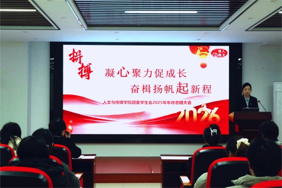 12月28日下午,人文与传媒学院团委学生会以“凝心聚力促成长,奋楫扬帆启新程”为主题,召开2025年年终总结大会。文传学院辅导员余玲玲老师、周菡老师,各学生社团负责人与全体学生会成员与会。盘点过往,擘画未来。