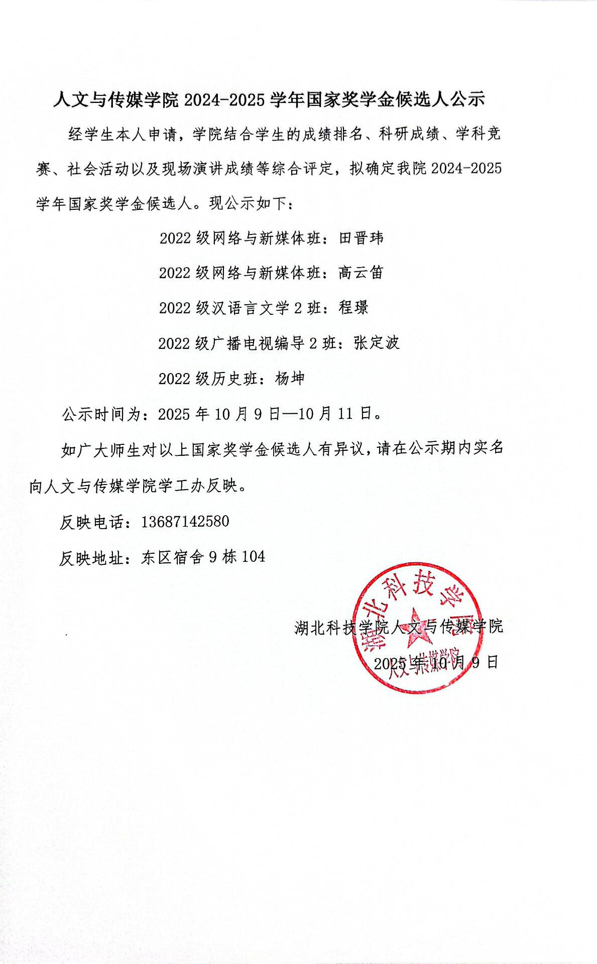 人文与传媒学院2024-2025学年国家奖学金候选人公示