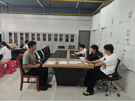 招聘会现场规划明晰,分设独立的候考区与面试区,营造出庄重而专业的求职氛围。应聘学生在候考室有序准备,平复心情;随后在工作人员的引导下,依次进入考场,接受面试官的全面考察。整个面试环节设置科学,问题设计兼顾理论深度与实践能力,有效评估了学生的逻辑思维、专业积淀、临场应变及与目标岗位的匹配度。
